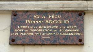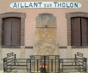 Aillant-sur-Tholon, plaque apposée sur la façade de la maison natale de Pierre Argoud le 15 décembre 1946. |