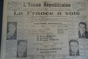 - La liste du PCF et d’Union Républicaine et Résistante comprend Prosper Mocquet, Lucien Prost, Maria Valtat et Paul Verneiges. La tête de Liste, Prosper Mocquet, ancien député de la Seine, n’est pas connue dans le département. C’est le premier « parachutage » politique de l’après-guerre dans l’Yonne. Toutefois, l’effet est atténué par une intense propagande électorale, dont l’approche a été renouvelée pour toucher les milieux ruraux.