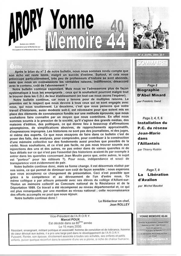 Adresse postale : Centre de documentation de l'ARORY, 5 rue Camille Desmoulins, 89000 Auxerre